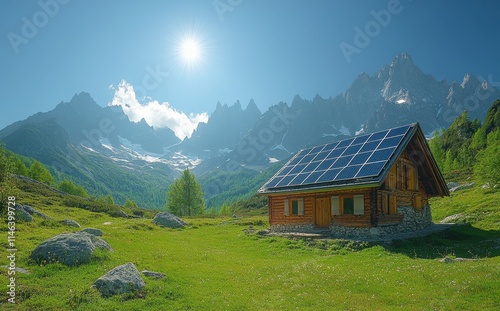 © KADER, Obraz premium Solar panels on lush green grass in the Alps under clear blue sky