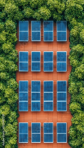 Fototapeta premium Solar panels surrounded by lush greenery, eco-friendly energy solution.