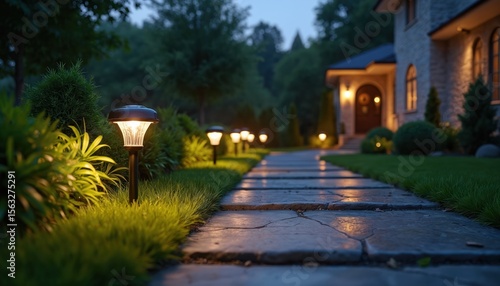 Fototapeta premium Solar-powered garden lights illuminate pathway. Stone pavement, green grass, bushes, cozy environment. Outdoor lighting, landscape design. Evening atmosphere. Sustainable architecture, modern