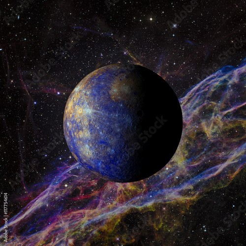 © Igor_Filonenko, Naklejka premium Solar system planet Mercury on nebula background 3d rendering. Elements of this image furnished by NASA