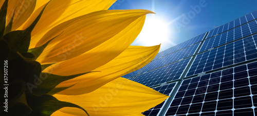 © visdia, Obraz premium Solarmodule und Sonnenblume vor sonnigem Himmel