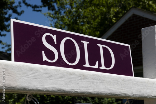© jetcityimage, Obraz premium Sold House sign for real estate transaction. Close-up with white letters on purple background.
