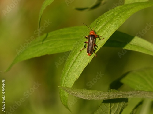 Naklejka premium Soldier beetle (Cantharis livida) - tiny black beetle with red head on green leaf, Poland