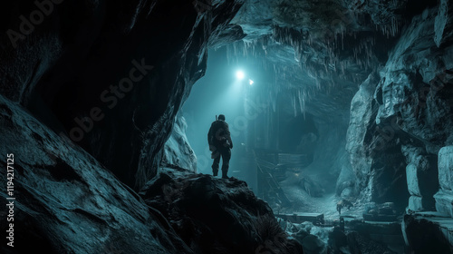 Obraz premium Soldier exploring icy cave with artificial light source
