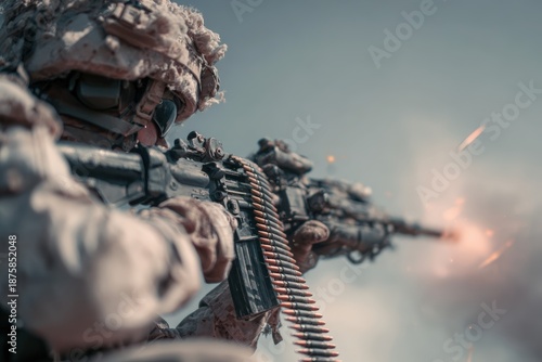 Fototapeta premium Soldier Firing Heavy Machine Gun in Battlefield with Camouflage