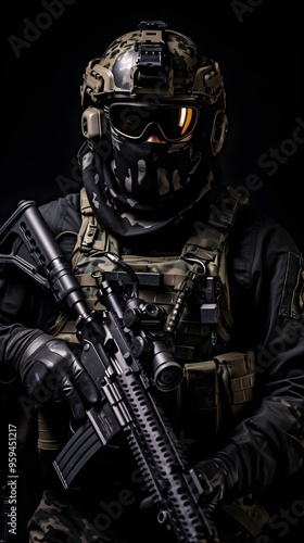 Naklejka premium Soldier Holding Rifle with Tactical Gear and Helmet