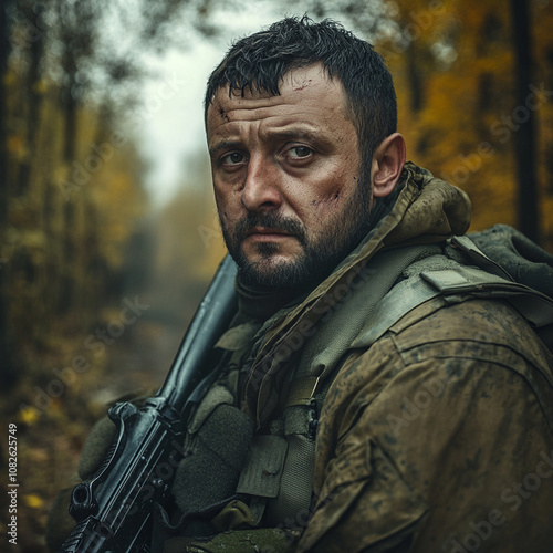 © Bohdan, Obraz premium Soldier in camouflage gear stands in a forest during autumn foliage