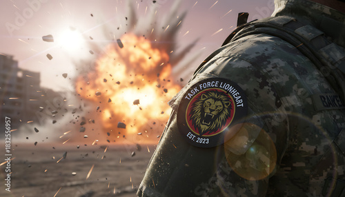 © Andesgn, Fototapeta premium Soldier in camouflage uniform with "Task Force Lionheart" patch stands near a large explosion in a war-torn city.
