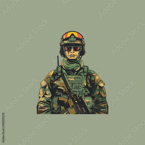 © abedehkim _, Fototapeta premium Soldier in full combat gear Flat vector illustration