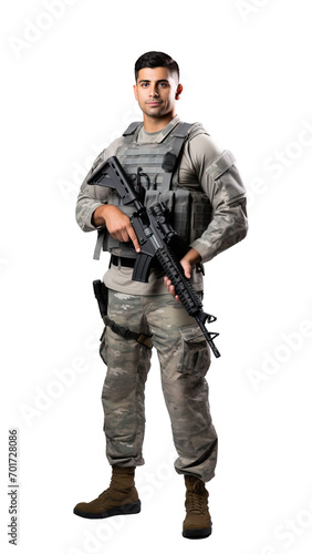 Fototapeta premium Soldier in military uniform with gun, a young man isolated on transparent white background