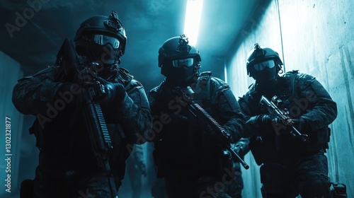 © Acronym, Naklejka premium Soldier in tactical gear and camouflage uniform holding a rifle. AI generated!