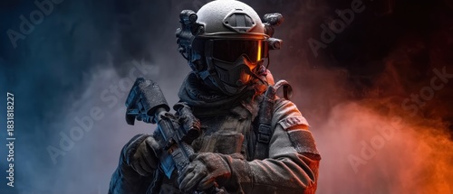 © setiadio, Fototapeta premium Soldier in tactical gear with a weapon