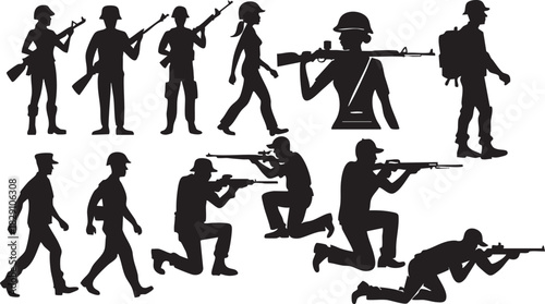 Naklejka premium Soldier Military War Silhouettes on White Background Vector Fully Editable...