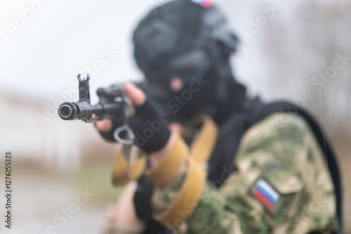 © diy13, Fototapeta premium Soldier or militiaman in camouflage with assault rifle fighting in ruins. A special forces soldier storms a destroyed building. concept of war and military anti-terrorist exercises.