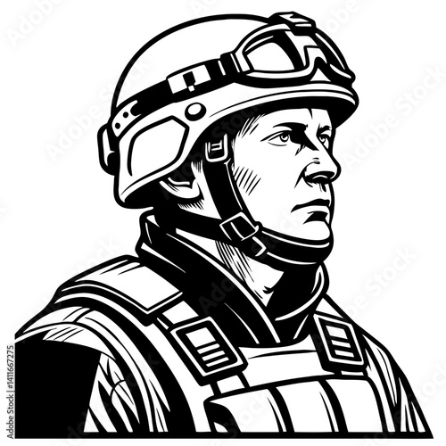 © Kiss, Obraz premium Soldier Portrait Illustration Military Helmet Tactical Gear Vector Art Design