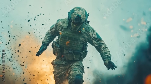 © Firly, Fototapeta premium Soldier Running Through Explosions Combat Scene