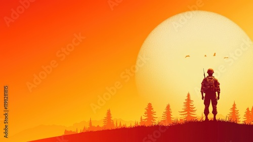 Naklejka premium Soldier Silhouette Against Dramatic Orange Sunset