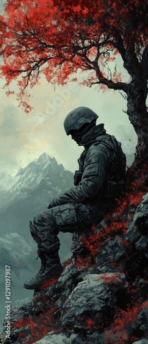 Fototapeta premium Soldier sits beneath a tree with red leaves and mountains