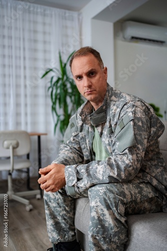© Jelena, Fototapeta premium Soldier sitting on sofa looking sad at home