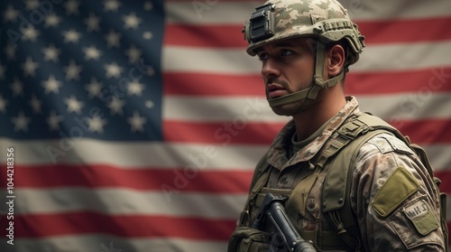Fototapeta premium Soldier standing in front of American flag patriotic military scene