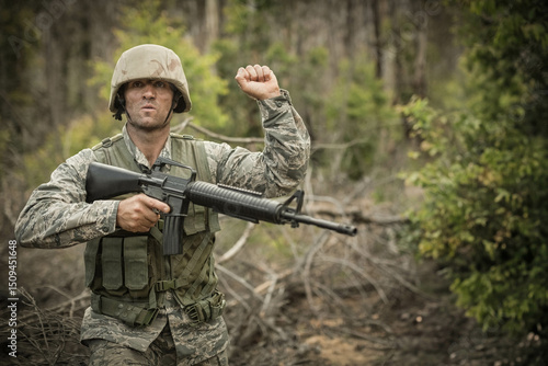 Fototapeta premium Soldier wearing camo helmet vest standing in forest clearing raising arm...