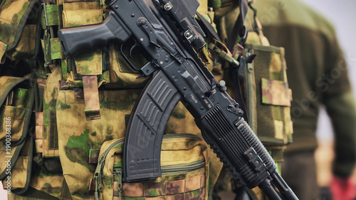 Fototapeta premium Soldier wearing camouflage vest holding a modern ak-47 assault rifle