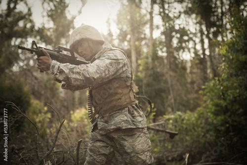Fototapeta premium Soldier wearing tactical vest and helmet, moving through dense woodland, scanning ahead with rifle