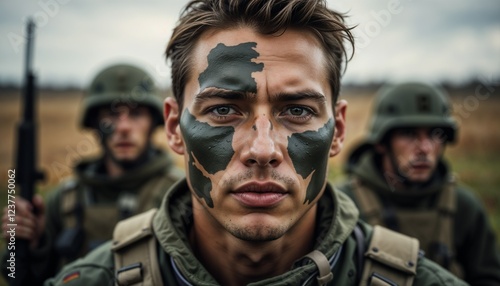 © Ekaterina, Fototapeta premium Soldier with camouflage face paint in military training