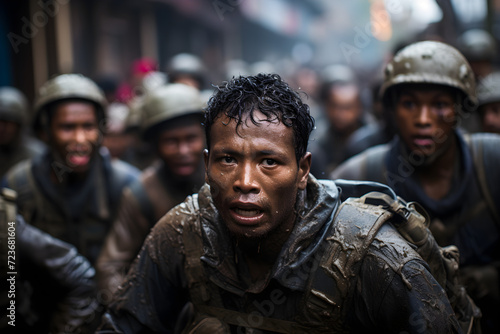 © Impact AI, Fototapeta premium Soldiers helping civilian evacuation from city war zone