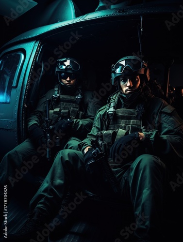 © lolya1988, Obraz premium Soldiers in tactical gear are sitting inside a helicopter, ready for action.