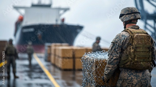 © NovaVision, Fototapeta premium Soldiers meticulously load boxes onto a ship in a rainy port, ready for transport.