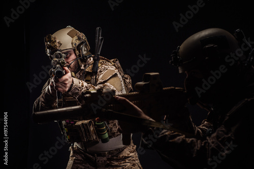 © kaninstudio, Naklejka premium soldiers or private military contractors holding rifle. Image on a black background. war, army, weapon, technology and people concept