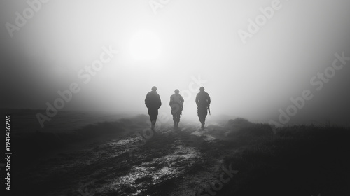 © Bonsales, Fototapeta premium Soldiers trekking through thick mist on a desolate path, symbolizing determination, a difficult journey, and an unknown objective