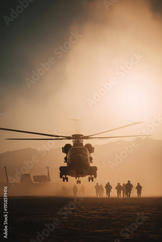 Fototapeta premium Soldiers walk towards helicopter under sunset in dusty landscape during...