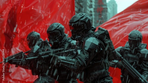 Obraz premium Soldiers with guns standing in the rain. Suitable for military or...