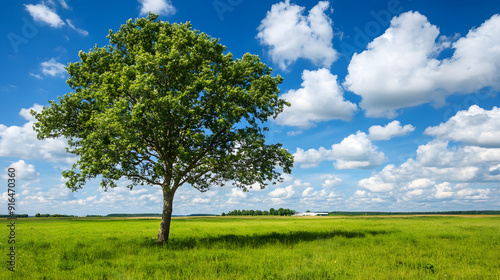 © Steve, Obraz premium Sole Tree in Foreground of Serene Landscape with Distant Hospice, Symbolizing Calm and End-of-Life Solace