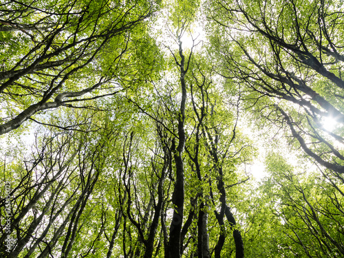 © YVO-Photos, Fototapeta premium Soleil filtrant à travers une forêt de hêtres au printemps avec son feuillage vert tendre, vue de dessous