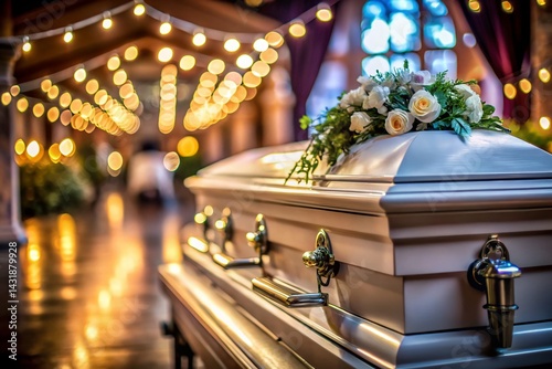 © Adisorn, Fototapeta premium Solemn White Casket in Hearse: Funeral Service Preparation Stock Photo