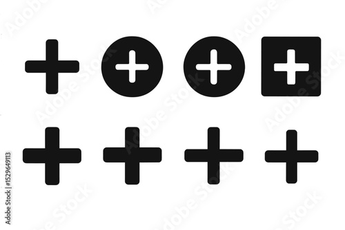 © Olha, Fototapeta premium Solid Add Icons. Solid style icons of basic add actions: plus icon, big + button, add circle icon, square with plus, solid filled