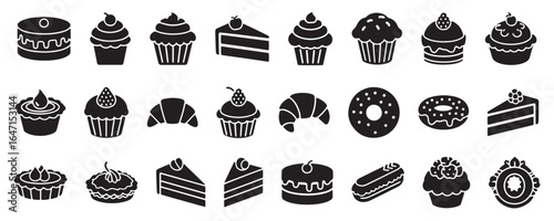 Fototapeta premium Solid Black Bakery Icons. Cakes, Cupcakes, Muffins, Pastries, and Dessert...