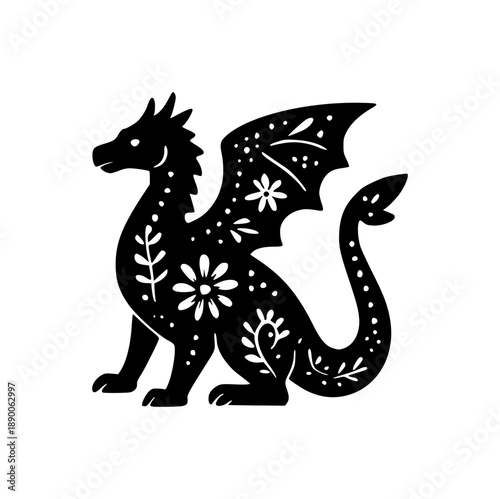 © Dingle Design, Fototapeta premium Solid Black Dragon Silhouette in Mexican Folk Art Design Element