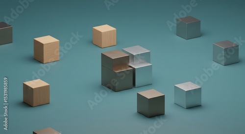 © Eko, Fototapeta premium Solid dusty teal background with modular cube props and diffused edge lighting 2