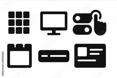 Fototapeta premium Solid UI Icons. Solid style icons of interface design: UI grid, control screen, toggle panel, interaction block. Solid style of