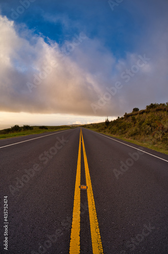 © Cam, Naklejka premium Solid yellow lines on road to top of Haleakala crater on Maui Hawaii