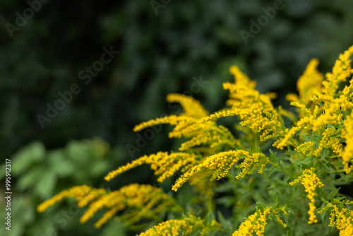Obraz premium Solidago canadensis blooms wildly in nature in late summer
