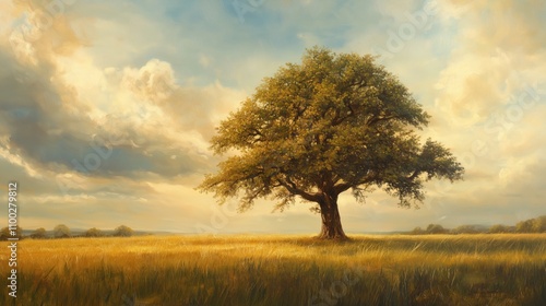 Fototapeta premium Solitäre Eiche in einer weiten goldenen Ebene