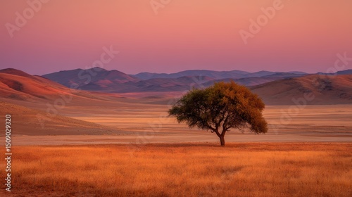 © Marina, Obraz premium solitary acacia tree at golden hour with red-orange sky and distant desert hills