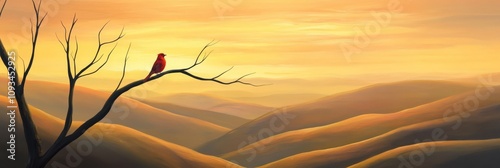 © AI Photo Stock, Obraz premium Solitary Bird at Sunset - A red bird perched on a bare branch silhouetted against a vibrant sunset over rolling hills. Symbolizes peace, solitude, hope, resilience, and nature.