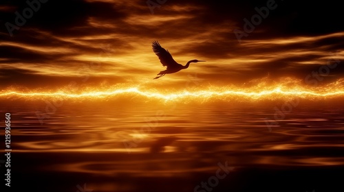© Big9869, Obraz premium Solitary Bird Soaring Over Fiery Sunset Seascape