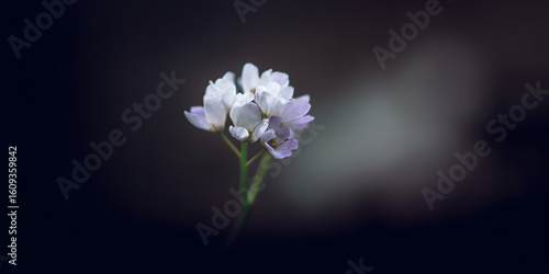 © Tiago, Obraz premium Solitary Bloom: A delicate cluster of light lavender blossoms gracefully emerges from a background of deep shadow, the pristine white petals and gentle green stem, bathed in the soft light.